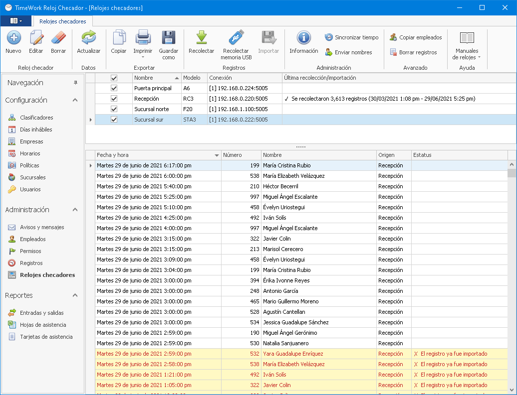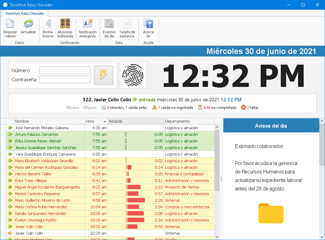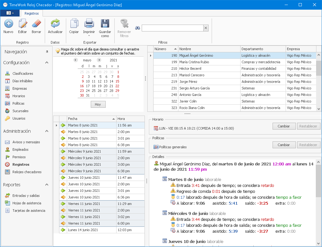 El sistema TimeWork Reloj Checador 2 gestiona fácilmente los horarios, políticas y permisos del personal, y genera reportes de asistencia y puntualidad al instante.
