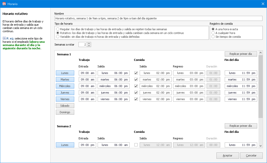 Defina horarios fijos con horas de entrada y salida bien definidas, o variables para empleados que laboran dentro de un rango de tiempo flexible.