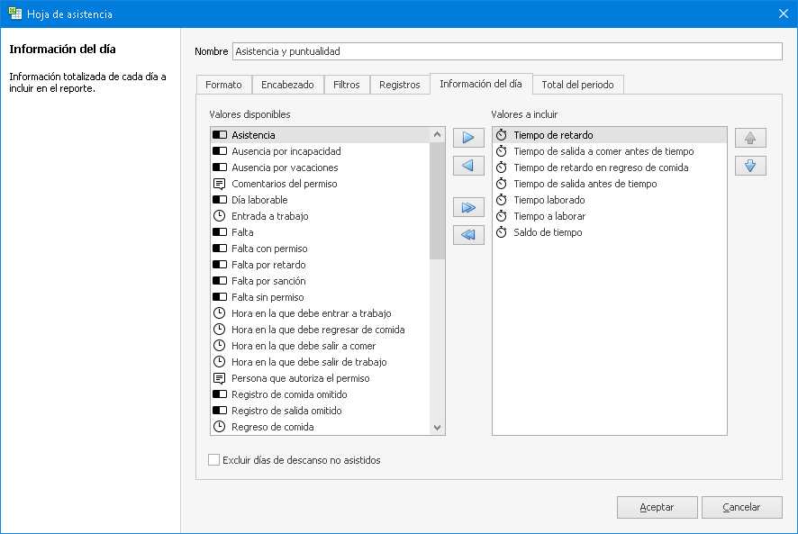 Más de 60 campos con información de tiempo y asistencia elegibles para mostrar u ocultar en los reportes, incluyendo: